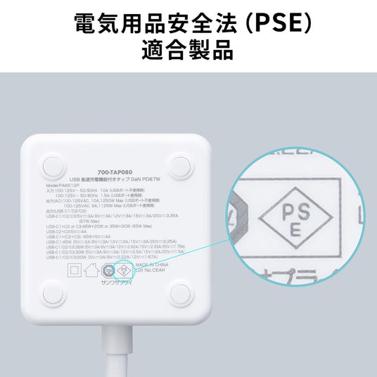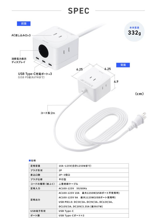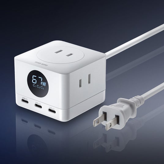 USB PD3ポート、最大67Wまでに対応した。GaN窒化ガリウム使用、電力表示機能付きでUSBのコンセントも3つ搭載した電源タップ