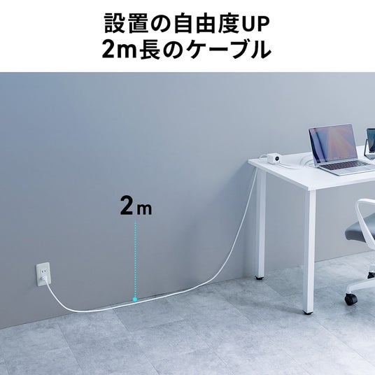 2mの長い電源ケーブルを採用しているので、デスクやベッドサイド、リビングルームなど、設置場所を選ばず使用可能です。また、コードは二重絶縁タイプで安全性も抜群で、家庭やオフィスでの幅広いシーンで活躍します。