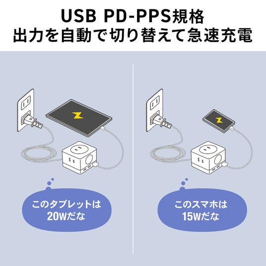 接続された機器に応じて、自動で電力を最適に配分。充電効率が向上し、各デバイスを安全に保護します。特に複数デバイスを同時に充電する際に便利です。
