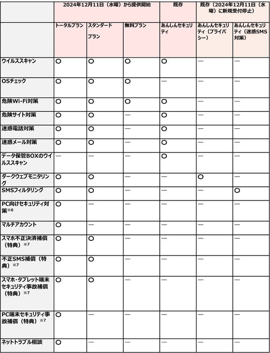 なお、スタンダードプラン、トータルプランの提供開始に伴い、「あんしんセキュリティ(プライバシー)」「あんしんセキュリティ(迷惑SMS対策)」は、2024年12月11日(水曜)に新規受付を停止いたします(※2)。