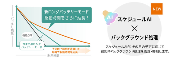 また、NPUに必ずしも依存するわけではないが、NECオリジナルのスケジュールAIや行動予測AI、その応用となるバッテリマネジメント機能など、NEC独自のAI機能も持つ。例えば、1日の予定に合わせて、輝度やバックグラウンド処理制御により消費電力を自動的に抑制し、その日の予定終了までのバッテリ駆動時間を確保する「ロングバッテリーモード」や、ユーザーの1週間の行動を学習して外出前などではバッテリ充電を100%、それ以外では80%に抑えることで劣化を防ぐ「スマート充電」、利用時間帯を予測して、それ以外ではモダンスタンバイから休止状態に移行する「スマート・スタンバイ」といった効果的な活用が可能だ。
