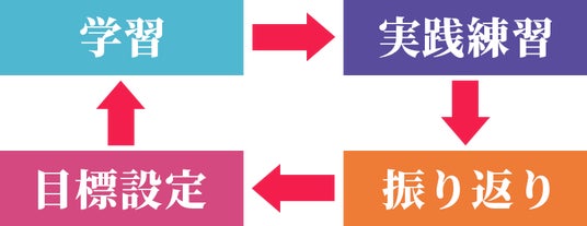 学習のプロセスは、「学習 → 実践練習 → 振り返り → 次回目標設定」のサイクルを繰り返すことで、スキルを着実に定着させる仕組みです。