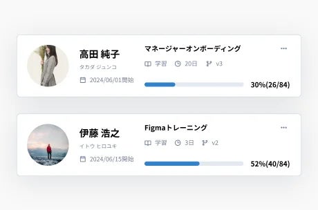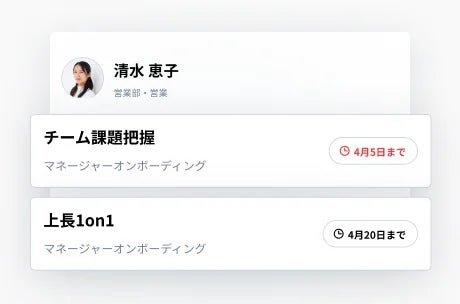 本アプリケーションでは、効率的なオンボーディングを実現するため、人事やマネージャーが、入社・異動・昇格した社員を対象に、実施すべきタスクを一覧化する「ラーニングコース」機能を備えています。これにより、人事やマネージャーは社員ごとにタスクの進捗状況を確認できるほか、社員は自身のタスク管理・達成度を把握することができます。