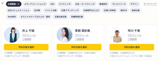 広報戦略、メディアリレーションズ、SNSなど、広報業務をカテゴリで分類しました。この中から課題に合うカテゴリのボタンをクリックすることで、その課題に対応できる専門のメンターが表示されます。