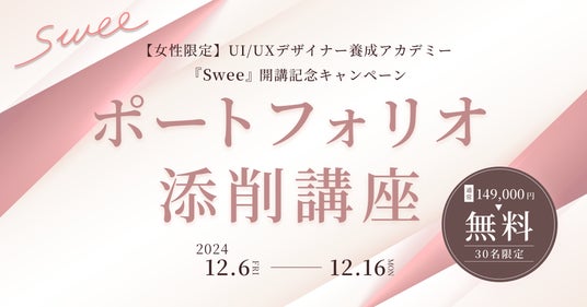 女性限定:UI/UXマスター養成オンラインアカデミー『Swee(スウィー)』(代表:円山 颯流)は2024年12月16日(月)までの期間限定で、UI/UXデザイナーへのキャリアアップを目指す方(先着30名)を対象に「ポートフォリオ添削講座」の無料提供キャンペーンを実施いたします。