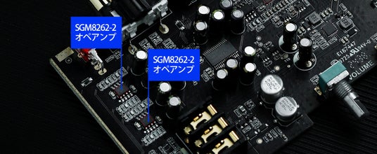 SG micro社の「SGM8262-2」オペアンプを2基、ヘッドホンアンプ回路へ搭載し、SAMYOUNG 47μF×4、Panasonic FC/47μF×8、ELNA Silmic II/47μF×5の厳選されたコンデンサを、回路へ分配配置しています。