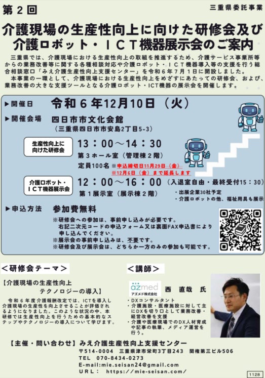 2024年12月10日(火)に三重県で開催されるこのイベントは、介護分野における生産性向上を目指し、介護人材の不足解消や介護の質向上、働きやすい職場づくりを推進するための業務改善に焦点を当てたイベントです。この展示会では、介護現場の方々に実際のテクノロジーを見たり体験したりする機会を提供し、最新の介護ロボットやICT機器を活用することで、事業所の生産性向上を促進します。