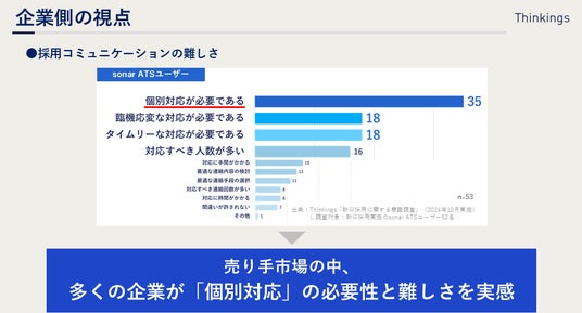 企業側に採用コミュニケーションの難しさについて聞くと、「個別対応が必要である」がTOPとなりました。一方で「マンパワー不足」や「候補者の心情を理解できない」といったニーズの把握など、個別対応に苦慮する企業も多いことがわかりました。