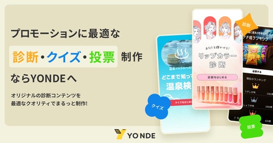 本日、2024年12月6日、株式会社YONDE(本社:福岡市中央区、代表取締役:田坂洋一)は、オリジナル「診断・クイズ・投票」コンテンツ(以下「診断コンテンツ」と略す)制作代行サービスの提供を開始いたしました。