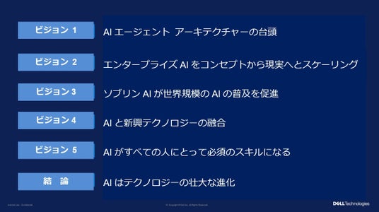 ローズは、AIが通信ネットワークの運用に革命をもたらすとともに、PCをAIインフラストラクチャーに欠かせない構成要素へ変えるなど、さまざまな業界に与えるAIの幅広いインパクトについても指摘しています。デル・テクノロジーズの製品をはじめとする、AI向けに最適化されているPCの普及、またオンプレミスAIソリューションの導入の増加は、AIが広範なテクノロジー エコシステムに広く統合されている状況を実証しています。