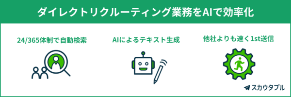 「スカウタブル」は、同社が開発した採用業務を効率化するAIツールを活用。主な機能として、採用ポジションに適する人材を自動検索し、候補者の経歴に基づき個人に応じたスカウト文面を自動で作成する。また、ダイレクトリクルーティング媒体に登録または情報更新した直後の「アクティブな候補者」に向け、スカウトメールを迅速に送信する。