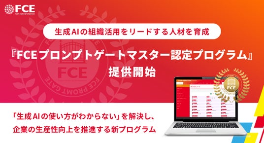 株式会社FCE(東京都新宿区、代表取締役社長:石川淳悦、東証:9564)は、生成AIプロンプトの学習・社内共有・保管管理などの機能を一括で提供する、生成AI組織活用プラットフォーム「FCEプロンプトゲート」を使いこなしながら、組織の生成AI活用を強力に後押しし、組織の労働生産性向上を牽引する人財育成プログラム「FCEプロンプトゲートマスター認定プログラム」を2024年12月より本格的に開始することをお知らせいたします。