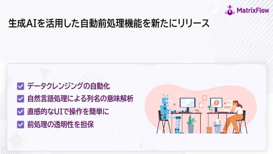 株式会社MatrixFlow(本社:東京都、代表取締役:田本芳文)は、本日、同社が提供するAIプラットフォーム「MatrixFlow」に、生成AIを活用したデータの自動前処理機能の新規リリースを発表しました。この新機能は、データ分析における初期段階で最も時間と労力を要する前処理作業を効率化し、より迅速なデータ活用を可能にします。