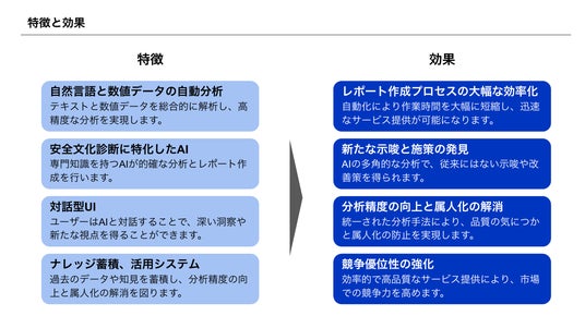 これらの課題を解決するべく、株式会社SALT2は、三井物産インシュアランス・ホールディングス株式会社と連携し、2024年8月より生成AIやデータサイエンスの知見を駆使した安全文化診断の高品質化・効率化システムの実証実験を実施し、その有用性を確認いたしました。この実験結果を踏まえ、この度本システムの開発に本格的に着手いたしました。