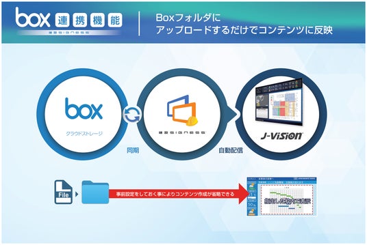 Box内の指定のフォルダをアップロードするだけで、Boxオブジェクトに反映され、「建設SIGNESS」対応のサイネージディスプレイに表示させることができます。
