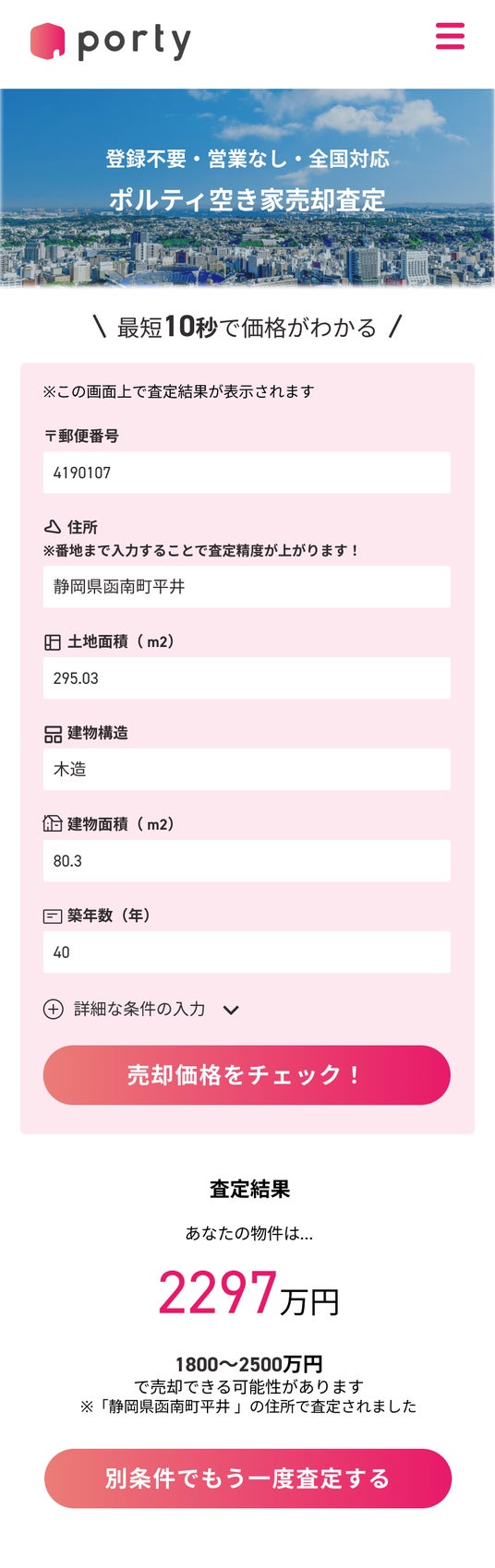 個人による空き家の売却を円滑に行えるようにするため、AIによって気軽に予想売却金額を算定できるWebツール「ポルティ空き家売却査定」(https://porty.co.jp/sale-assess)も同日にサービス提供を開始いたします。