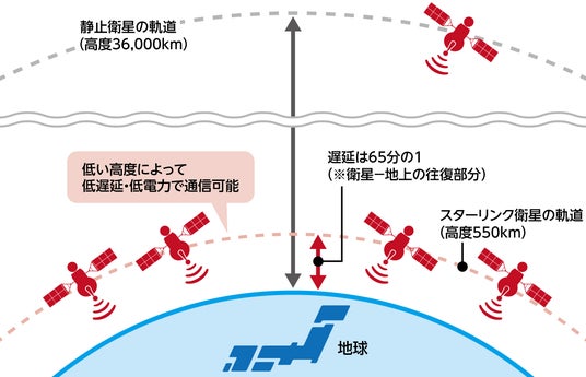 Starlinkは、高度550kmの低軌道に打ち上げられた数千基の通信衛星と地上に設置される各ユーザーのアンテナが送受信することで、インターネットに接続するという仕組みです。従来の高度36,000kmに打ち上げられた静止衛星と比較すると、地表から約65分の1という近さのため、大容量で低遅延なインターネット接続を可能にしています。また、地上波と周波数が異なる高周波帯のKuバンド(ケーユーバンド)を採用しているため、回線が混みにくい安定した通信を実現することができます。