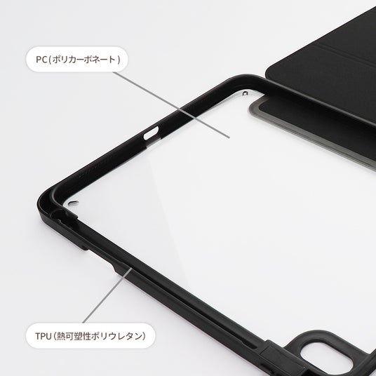 ケースには柔軟性に優れたTPU素材と、耐衝撃性の高いポリカーボネート素材を組み合わせているため、衝撃や擦り傷からiPad本体を保護しながらお使いいただけます。