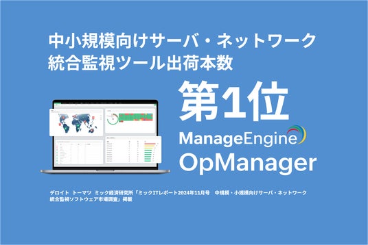 ゾーホージャパン株式会社(代表取締役:マニカンダン タンガラジ、本社:横浜市、以下、ゾーホージャパン)は、ネットワーク統合監視ツール「OpManager」がデロイトトーマツミック経済研究所株式会社の最新調査※により、2023年度における国内の中規模・小規模向けサーバ・ネットワーク統合監視ソフトウェア市場の出荷本数において、第1位を獲得したことをお知らせいたします。