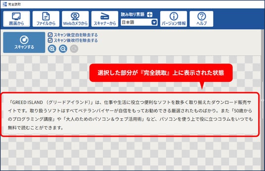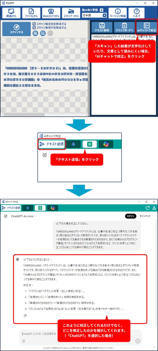 『完全読取』は、マウスでコピーできない「画像文字」や、「紙の書類」を読み取って「編集可能なテキストデータ」に変換するOCRソフトです。マイクロソフト社製OCRエンジンを採用しており、高速・高精度な変換が可能なほか、変換したデータを「AIチャット(ChatGPT・Gemini・Copilot)」に送信して文章を校正できるのが特長で、もし最初のスキャンで「誤変換」や「文字化け」があったとしても、AIによる校正により読みやすい文章にしてくれます。