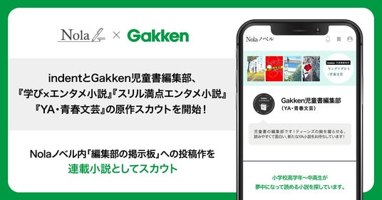 50万人を超える作家の皆さまが登録する創作プラットフォーム「Nola(ノラ)※1」を提供する株式会社indent(本社:東京都千代田区、代表取締役社長:釜形 勇気、以下「indent」)と株式会社学研ホールディングス(本社:東京都品川区、代表取締役社長:宮原 博昭)のグループ会社、株式会社 Gakken(本社:東京都品川区、代表取締役社長:南條 達也、以下「Gakken)は、12月12日(木)より、indentが運営する小説投稿サイト「Nolaノベル」内「編集部の掲示板」に「Gakken児童書編集部」の原作募集ページを開設し、子どもから大人まで楽しめる「学び×エンタメ小説」「スリル満点エンタメ小説」「YA・青春文芸」ジャンルの原作スカウトを開始いたしますことをお知らせいたします。スカウトした作品は、作品の特性に合わせ、電子書籍や漫画原作での展開を検討し、学研が運営するまんがポータルサイト「ガッコミ」(https://gakcomic.gakken.jp/about/)などで配信いたします。