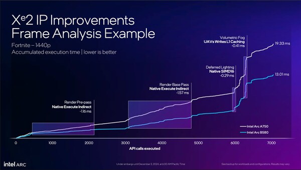 「Fortnite」を1フレーム処理する際には7000近くのAPIコールが発生する。これはその累積処理時間(フレームタイム)をグラフにしたもの。Arc A750(灰色)に比べB580(水色)は、描画行程のさまざまな部分において劇的に処理時間を短縮することに成功している