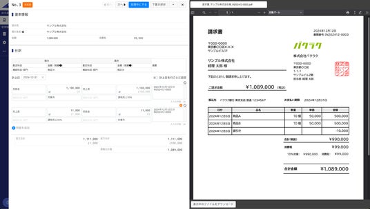 - バクラク請求書発行で作成した書類を見ながら仕訳の編集が可能