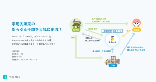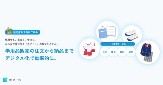 学校向け集金・会計サービス「スクペイ」を提供する株式会社MEME(本社:東京都中央区、代表取締役:齋藤舞、以下「MEME」)は、2025年4月より、学校指定購入品の管理機能をアップデートし、合わせて「スクペイα(アルファ)」を学校の販売店および業者(「以下「販売店」)向けに提供開始する予定であることをお知らせいたします。