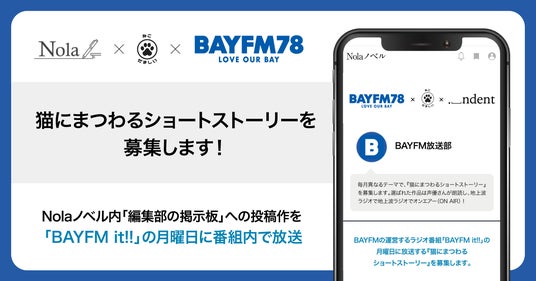 50万人を超える作家の皆さまが登録する創作プラットフォーム「Nola(ノラ)※1」を運営する株式会社indent(本社:東京都千代田区、代表取締役社長:釜形 勇気、以下「indent」)と株式会社ベイエフエム(本社:千葉県千葉市、代表取締役社長:久保 健、以下「BAYFM」)と株式会社ねこだましい(本社:千葉県浦安市、代表取締役社長:福井 政文、以下「ねこだましい」)は、“オリジナル音声IP創出“に向けた協業を開始し、12月12日(木)より、indentが運営する小説投稿サイト「Nolaノベル」内「編集部の掲示板」に「BAYFM放送部」のページを開設、BAYFMの運営するラジオ番組『it!!』の月曜日に放送する『猫にまつわるショートストーリー』の原作スカウトを開始いたしますことをお知らせいたします。