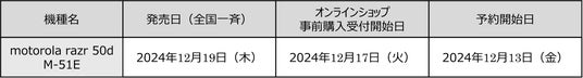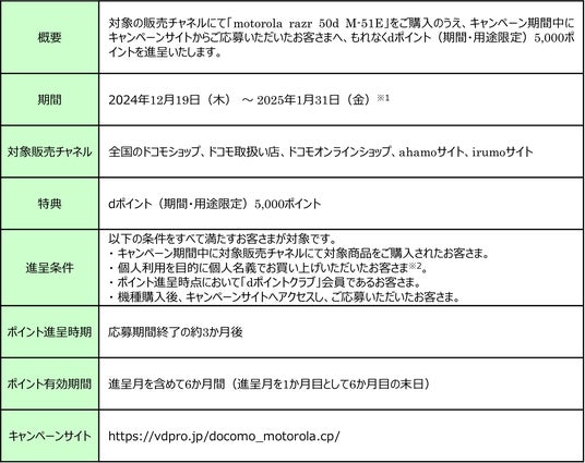 なお、「motorola razr 50d M-51E」の発売に併せたキャンペーンを2024年 12 月 19 日(木)から 2025年 1月31日(金)までの期間で開催いたします。キャンペーンの詳細は別紙をご確認ください。