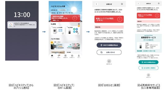 本機能では、事前に「ハピネスアップ」とペアリング(連携)したコネクテッド家電(冷蔵庫・洗濯機)の製品本体で不具合が発生した場合に、スマートフォンのホーム画面に「ハピネスアップ」からのプッシュ通知が表示され、アプリ上で対応方法の確認から修理のお申し込みまでをワンストップで対応することができます。また、「ハピネスプラス[長期保守サービス]」(有料)(*5)に加入されているお客さまには、アプリ上に自動で専用の画面が表示され、長期保守サービスでの修理対象としてお申し込みいただけます。