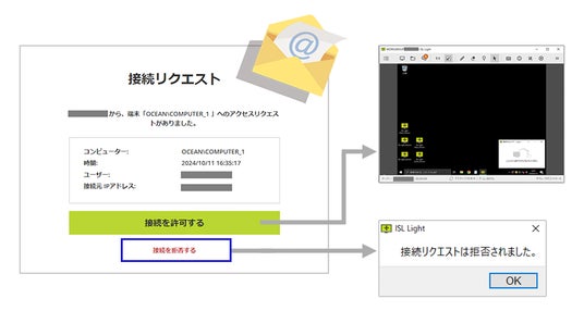 承認者は受信したメールから接続の「許可」または「拒否」が選択可能になり、ユーザーは接続が許可された場合にのみ接続できます。不正アクセス対策にご活用いただけます。