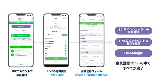 今回、ロゼット公式オンラインショップでは、ソーシャルPLUSを通してLINEログインを導入したことで、オンラインショップでの会員登録時にLINE公式アカウントへの友だち追加※1とLINEのID連携※2が完了します。