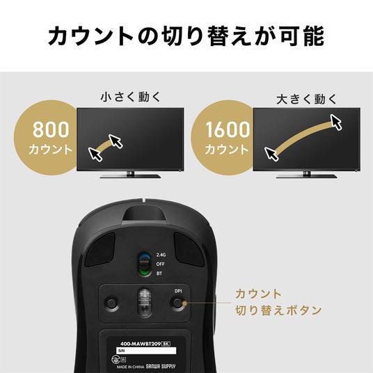 2.4GHzとBluetooth接続に対応。充電式で繰り返し使え、カウントの切り替えも可能と、マウスの標準的な機能も搭載。今までのマウスと使用感は変わらず、違和感なく使用することができます。