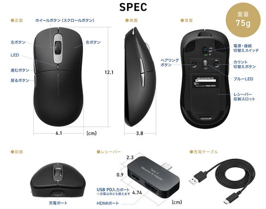 USB-CレシーバーにHDMIポート、USB-Cポートを搭載。PD100W充電・4K/60Hzの映像出力に対応し、USB 5Gbpsのデータ転送にも対応した3in1のハブ機能付きワイヤレスマウス