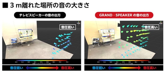 本製品は、音が進行方向に減衰せず遠くまで伝わる「ホーンスピーカー」と中低音域を再生する「ウーファースピーカー」のハイブリッド構造にすることで、テレビの音を遠くまで届けることが可能です。スピーカーの構成効果により、実験に使用した当社42型テレビのスピーカーと比較して約3m離れた場所で約1.5~1.7倍音圧が高くなることがわかりました。そのため、高齢者も含めどなたにでも聞き取りやすいスピーカーとなっています。