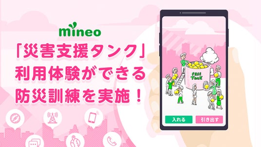 mineoは、通信をただのデータのやりとりではなく、「気持ちや想いを伝えるもの」と考えています。この考えから、mineoユーザー同士がパケットをシェアできる「フリータンク」を提供しており、災害時にはフリータンク内のパケットを被災地の方々に優先的に提供する「災害支援タンク」を開放するとともに、「災害支援タンク」を幅広く認知いただき、操作方法やパケットを通じた仲間との助け合いを体験いただく「mineo防災訓練企画」を実施してまいりました。