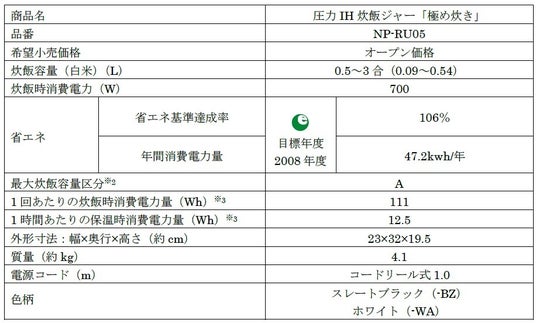 圧力IH炊飯ジャー「極め炊き」NP-RU05 左からスレートブラック、ホワイト