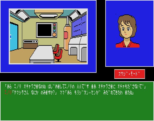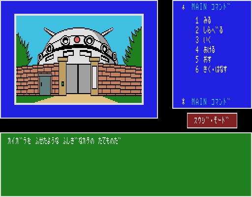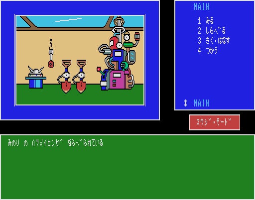 ゲームはコマンド選択方式+入力方式のアドベンチャーゲームとなっており、シーンに応じて「数字モード(選択)」、「会話モード(入力)」を駆使して攻略することになります。当時、本作は“スチャラカアドベンチャー”と称していたことからもわかるように、軽快でユーモラスな展開も見どころのひとつです。
