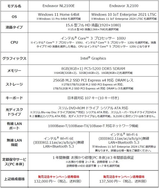 医療向けシステムなどでご利用いただける「Windows 11 IoT Enterprise LTSC」および「Windows 10 IoT Enterprise LTSC」を搭載した『Endeavor JL2100』も同時発売します。「Windows 11/10 IoT Enterprise LTSC」は、組み込みシステム向けに提供されているOSで、長期供給が可能なため専用アプリケーション資産を長きにわたりご活用いただけます。