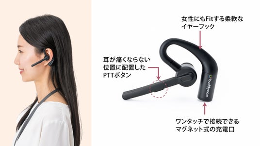 「Buddycom Fit」は、軽量で耳に優しく、長時間の装着にも対応する、AIノイズキャンセリング搭載のBluetoothイヤホンマイクです。特に、スタイリッシュさを求める職場環境や女性が多く活躍する業種に適したデザインと機能性を兼ね備えています。家電量販店・空港受付業務・大型の販売店・ホテルなど、多様な業務シーンでの使用を想定し、優れたパフォーマンスを発揮します。