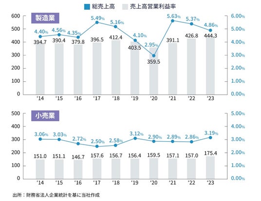 BtoB-EC市場規模の推移:製造業・小売業の総売上高および売上高営業利益の推移(単位:兆円)