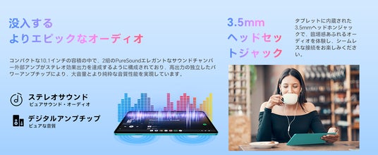 コンパクトな10.1インチの容積の中で、2組のPureSoundエレガントなサウンドチャンバー外部アンプがステレオ効果出力を達成するように構成されており、高出力の独立したパワーアンプチップにより、大音量とより純粋な音質性能を実現しています。タブレットに内蔵された3.5mmヘッドホンジャックで、臨場感あふれるオーディオを体験し、シームレスな接続をお楽しみください。