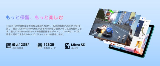Teclast P30の優れた効率性をご確認ください。4GBの高速LPDDR4X RAMを誇り、最大12GBのRAMのために8GBまでの余裕な仮想メモリ拡張を提供します。最大1TBの Micro SDカードの容量拡張をサポートし、ユーザのニーズに容易に対応できるストレージソリューションを提供します。