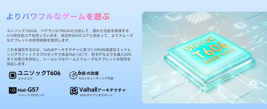 Unisoc T606は、ベテランSC9863Aと比較して、優れた性能を発揮するA75高性能コアを誇っています。高効率のA55コアと相まって、よりスムーズなタブレットの使用体験を提供します。