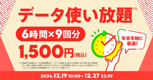 クリスマスから年末年始にかけての連休期間、家族や友人とのお出かけをしても安心なデータ使い放題トッピングを提供します。最大9連休になる方も多いことから、6時間データ使い放題(250円相当)(注2)を、9回分がセットでおトクに利用できます。