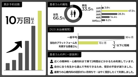 そこで、当社ではオンライン×対面の総合精神医療プラットフォームを通して、精神医療のアクセシビリティ向上により適切な医師との早期の出会いを提供しています。オンライン×対面の総合精神医療プラットフォーム『WeMeet』は、2022年1月からサービスを開始し、この度、当プラットフォームからの予約回数が10万回を突破しました。