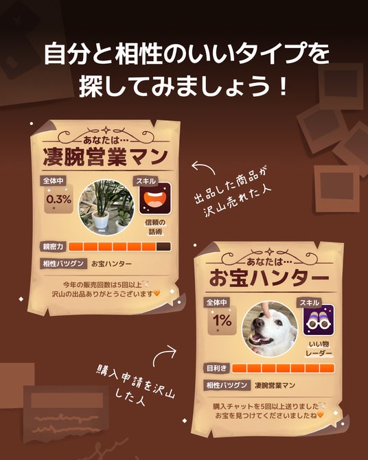 ユーザーの皆さまそれぞれの今年の活動を振り返る特別コンテンツです。「今年出品したアイテムは?」「どんなお買い物をした?」「一番キャロットを使った時間は?」など、振り返りを通して「こんなこともあったなぁ」と思いがけない思い出に出会うことのできる内容となっています。