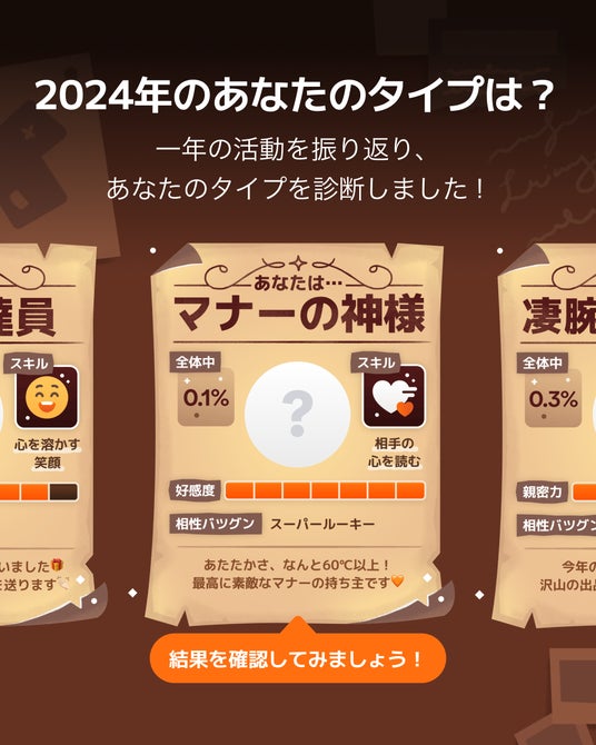 この度キャロットでは、一年キャロットアプリをご利用いただいたユーザーの皆さまへの感謝の気持ちを込めて、「あなたの一年の振り返り、タイプを診断する」コンテンツをリリースしました。