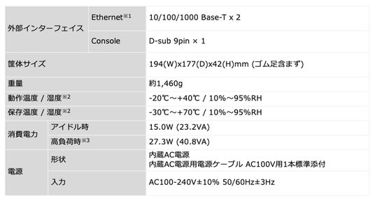 ※1 Auto MDI/MDI-X対応。※2 結露なきこと。※3 全イーサネットポートをリンクアップし、stressコマンドによりCPU100%の状態にして計測。